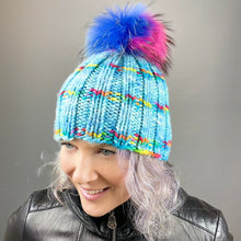 Shown in Rainy-Day Rainbow (#4) with a red raccoon fur pompom, and in Blue Skies and Rainbows (#2) with a two-tone hot pink and electric blue raccoon fur pompom.