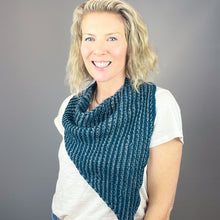 We worked ours in tweedy yet silky, rustic yet elegant, Acadia. Spun from carefully selected layers of merino, silk, and natural brown baby alpaca, it's then hand dyed in rich, heathered tones. Whether you choose bold colors or subtle contrast, you'll love working the Bayshore Bandana Cowl! Get your kit now and be ready to wear your new cowl for the crawl!