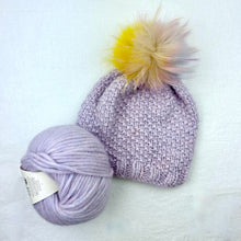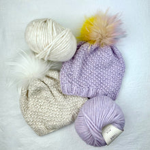 Shown in Lilac with a light unicorn raccoon fur pompom and Ivory with a white raccoon fur pompom.