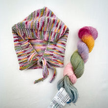 This charming bonnet is knitted flat, using just knit and purl stitches - no shaping! - and finished with a 3-needle bind-off or Kitchener Stitch. Super easy and fun to make!