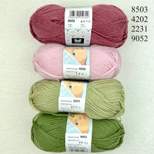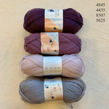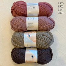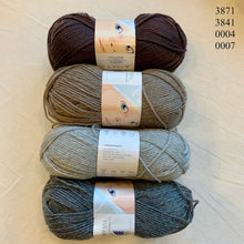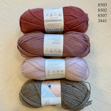 ~10 skeins (2 each of colors A and D. 3 each of colors B and C.) Dale Garn Baby Ull, 100% Australian merino wool, 180 yards each.