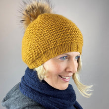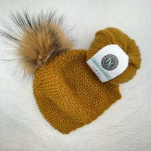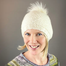 Shown in Gold with a Natural Raccoon Fur Pompom and Ecru with a White Raccoon Fur Pompom.