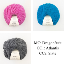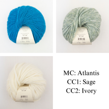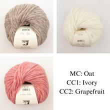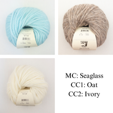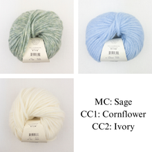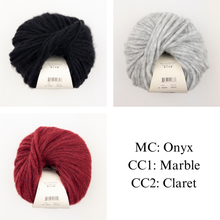 ~ 5 (6, 6, 6, 7) skeins MC Juniper Moon Beatrix, 54% Extrafine Merino Wool, 30% Angora, 16% Nylon, 109 yards each.