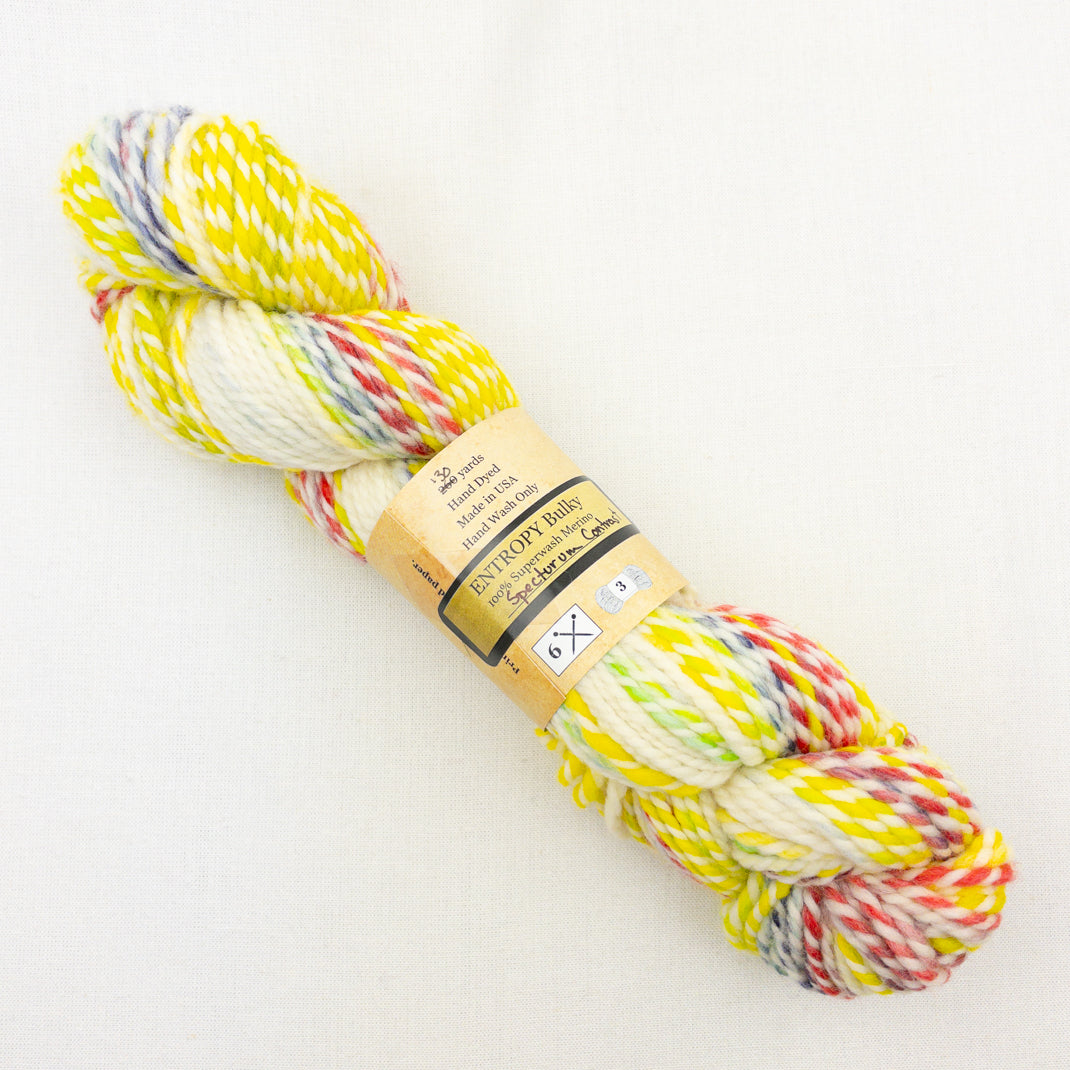 Hand dyed and milled in Pennsylvania, Entropy is spun in a unique style that creates beautiful color changes as you knit. No two skeins are exactly alike, so your project will be one of a kind! Entropy is squishy soft and perfect for quick bulky weight hats! Plus, we love getting the superwash version so you can use it for all things baby and kids!