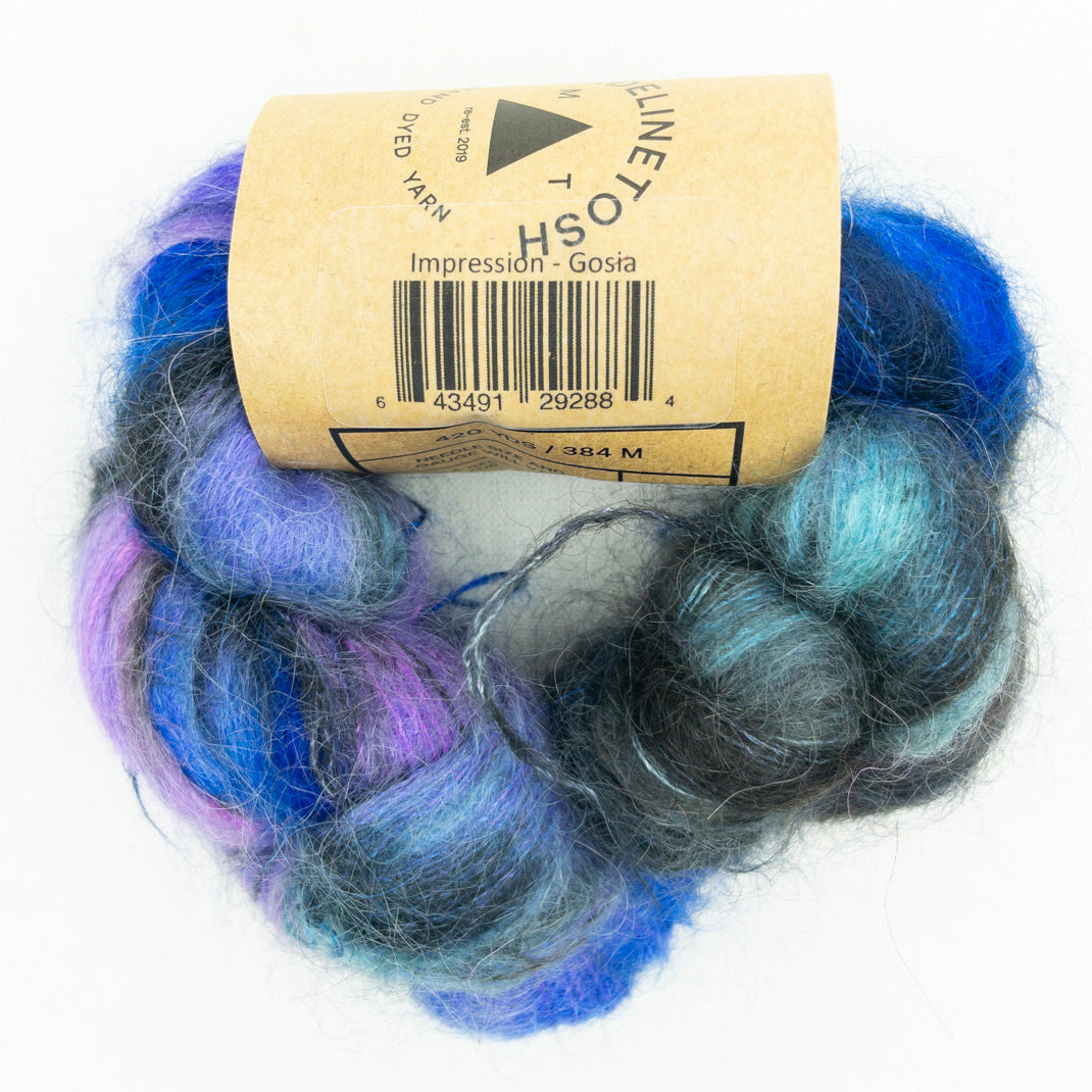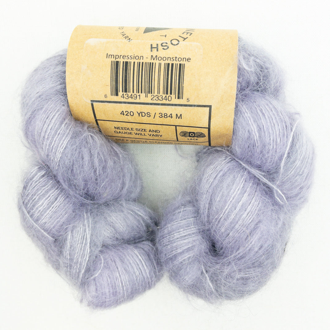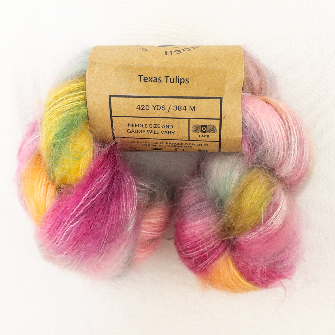 A lace weight mohair silk blend in the beautiful colors of Madelinetosh. Knit it solo for an airy lace project, hold it double and you have a DK weight yarn, or combine it with your favorite wool to add a luminous halo to your work.