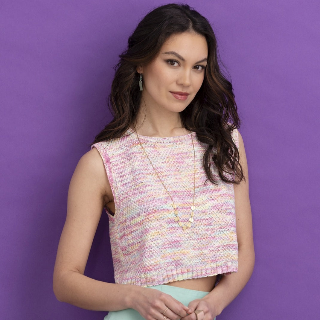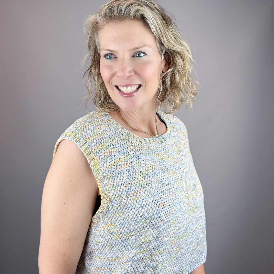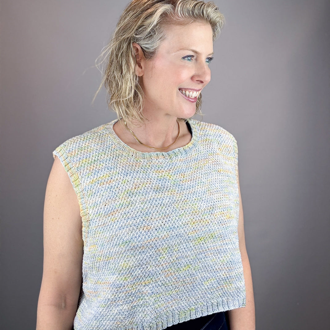 Cropped and boxy, the April Tank Top is a summer wardrobe staple. Knit in ethereal sparkling Huasco Cotón Glisten yarn. Fun to knit and fun to wear! Bonus, it's machine washable!