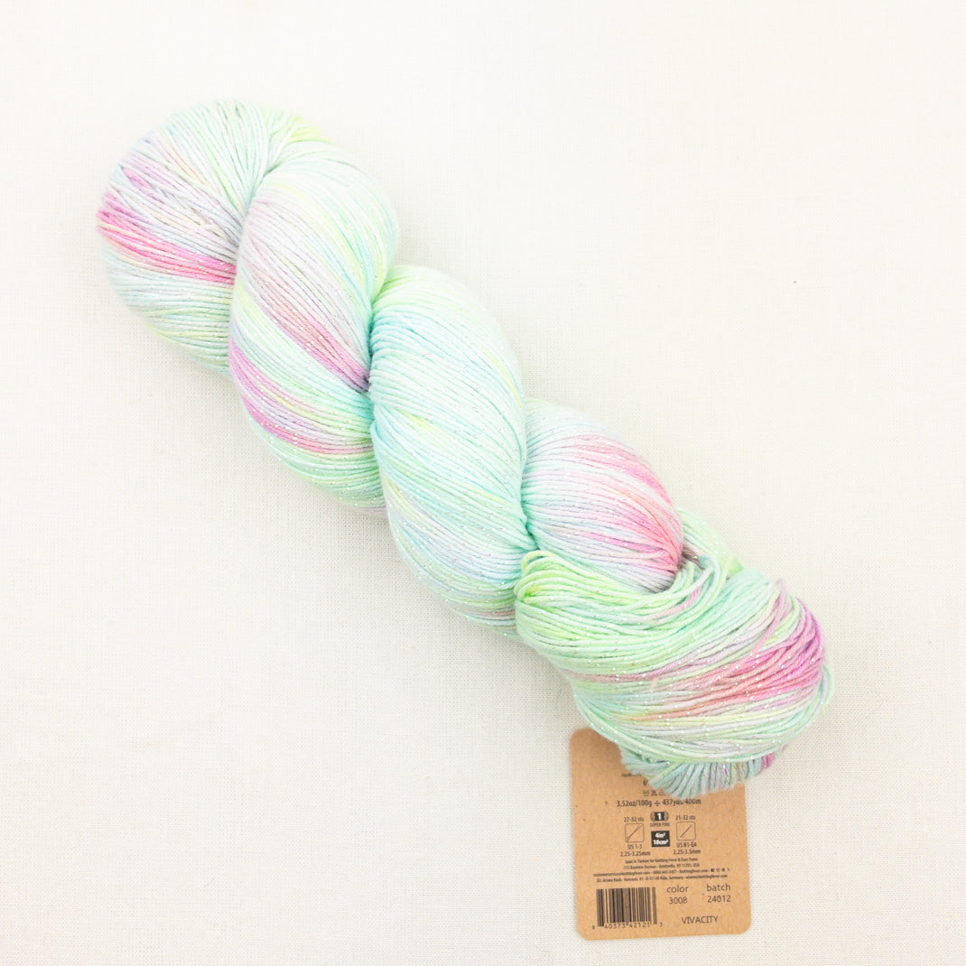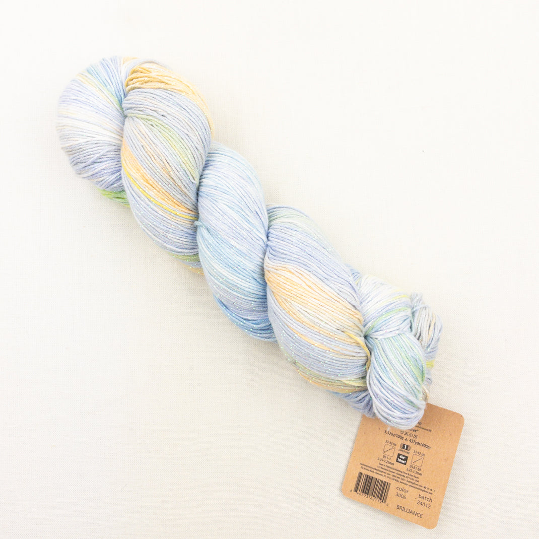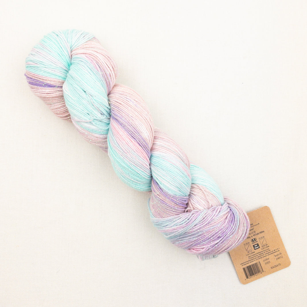 This ethereal sparkling cotton yarn captures the shimmer of a twinkling star. Hand painted in beautiful colors with a touch of lurex, Huasco Cotón Glisten will make a gorgeous shawl or garment! Lightweight and machine washable, you're going to love working with this new yarn!