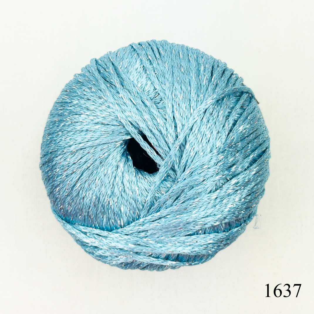 ~1 skein Contrast Color Karabella Glimmer, 90% Rayon, 10% Lurex, 141 yards.