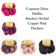 ~ 5 (5, 5, 5)(5, 5, 10)(10, 10, 10) skeins Madelinetosh Pashmina, 75% merino, 15% silk, 10% cashmere, 360 yards each.